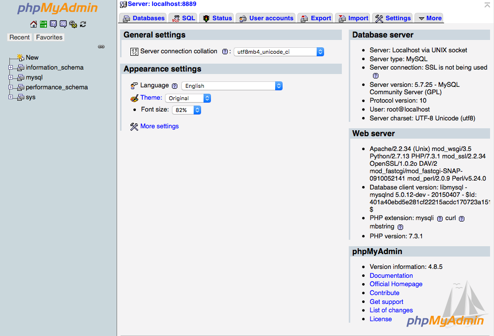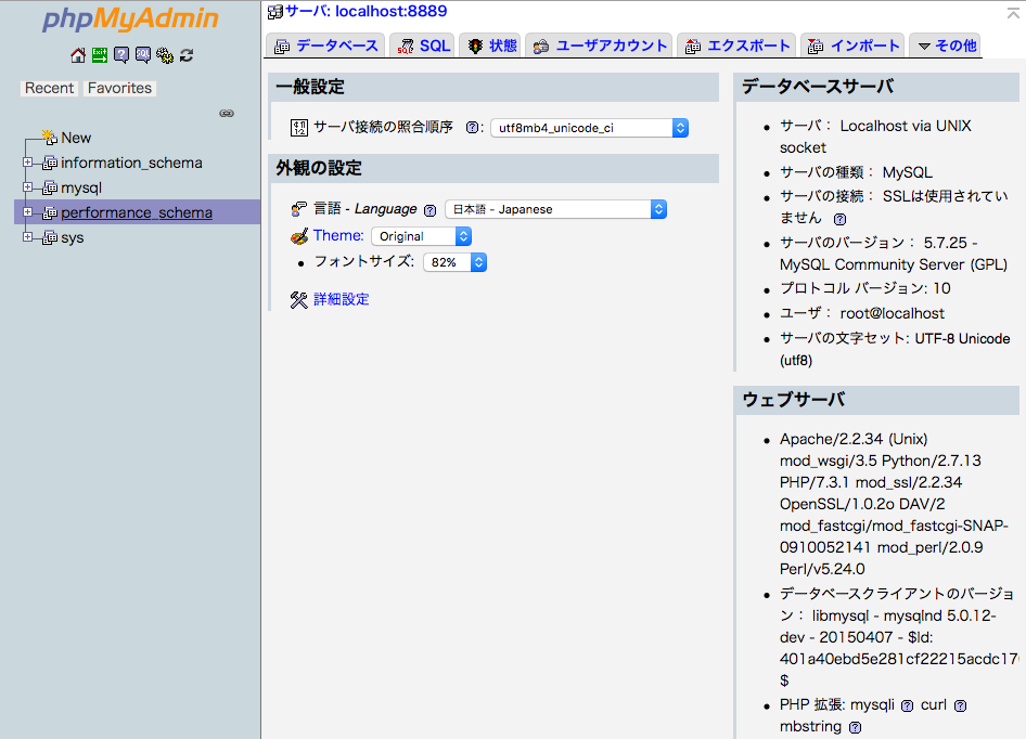 MAMPのスタート画面内の「MySQL can be administered with phpMyAdmin.」からphpMyAdminをクリック。