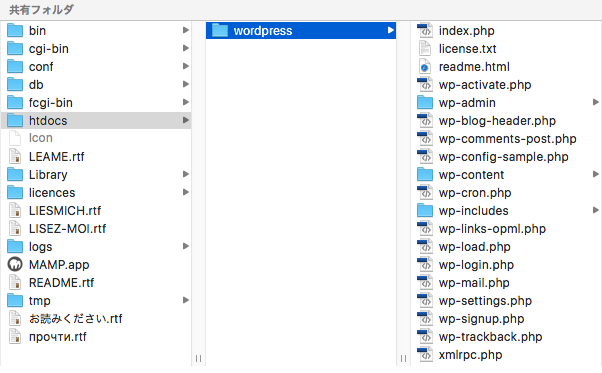 Apacheのドキュメントルートに解凍したwordpressフォルダをコピーする。(/Applications/MAMP/htdocs/)