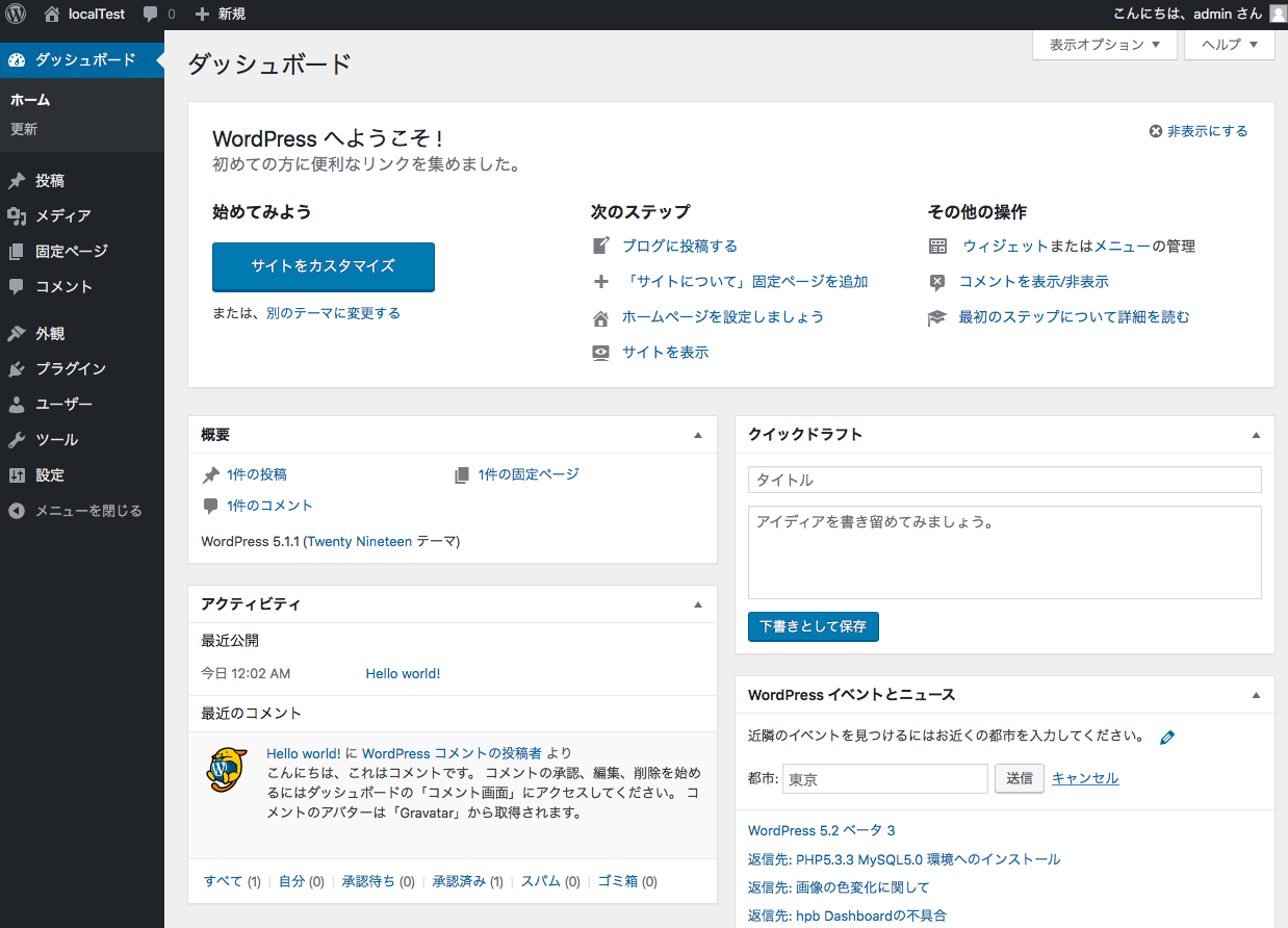 ダッシュボードが表示されたらWordPressのインストールが完了!